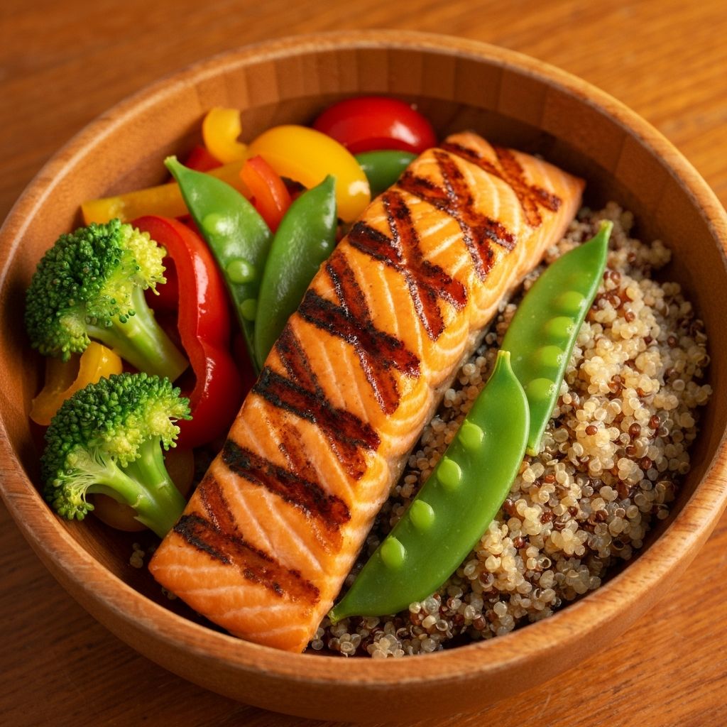 Grilled salmon, quinoa, steamed broccoli, edamame, teriyaki glaze